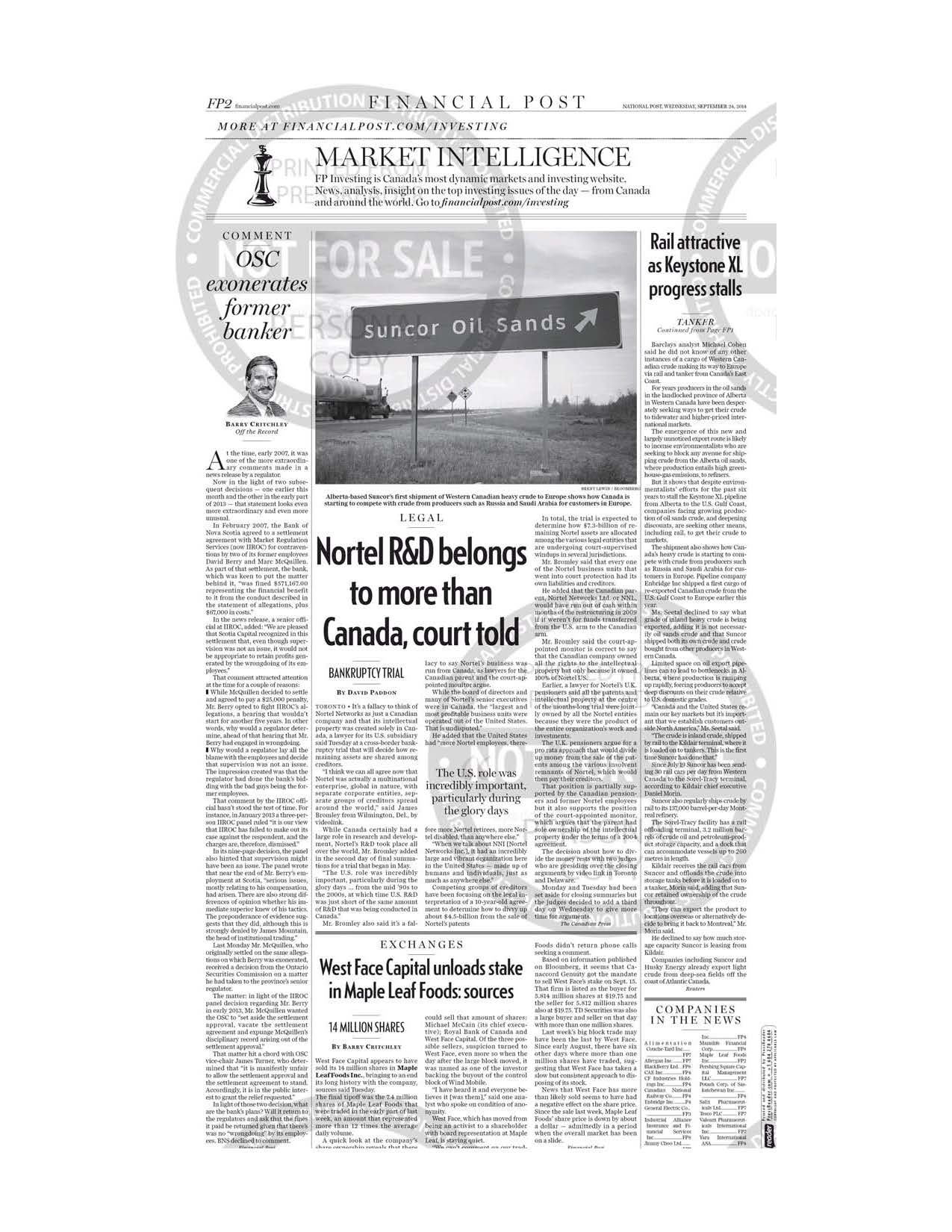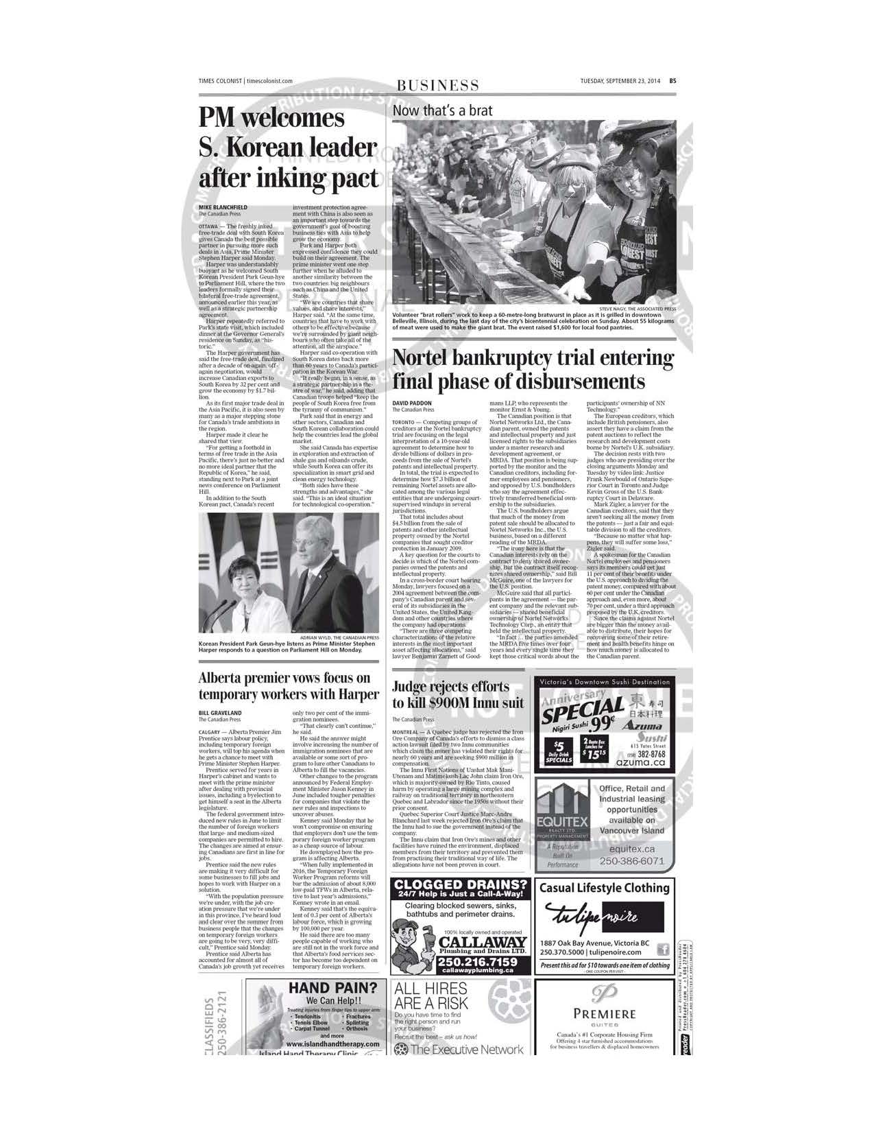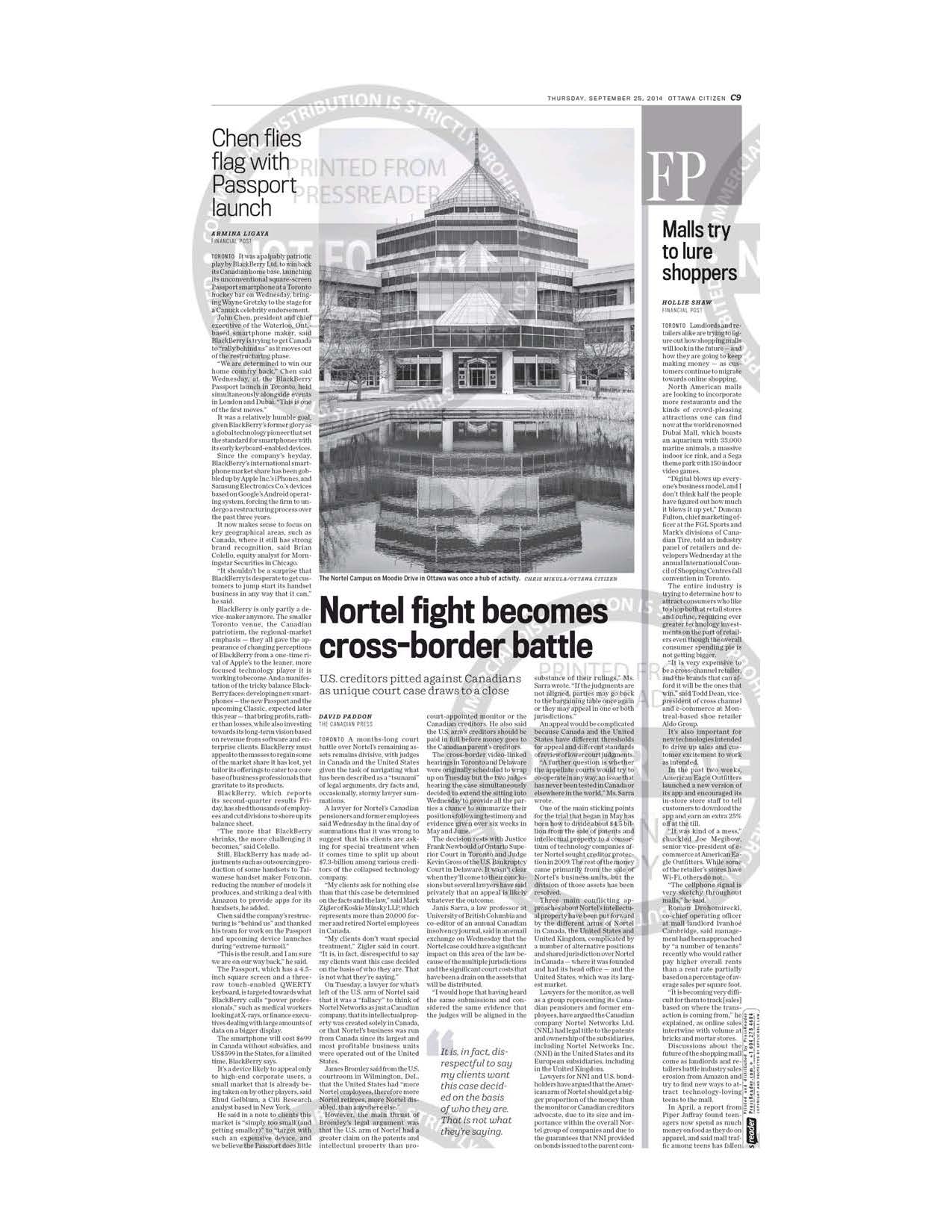 Nortel’s Days In Court Victoria Times-Colonist Sept. 23, 2014 National Post, Sept. 24, 2014 Ottawa Citizen, Sept. 25, 2014